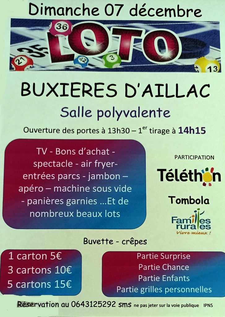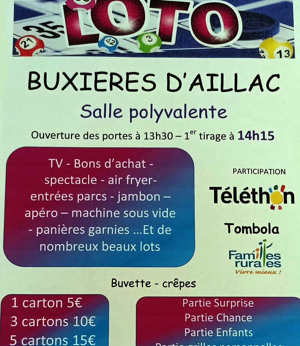 L’Association Familles Rurales de Buxières d’Aillac organise le Dimanche 07 décembre 2025 son Loto annuel.